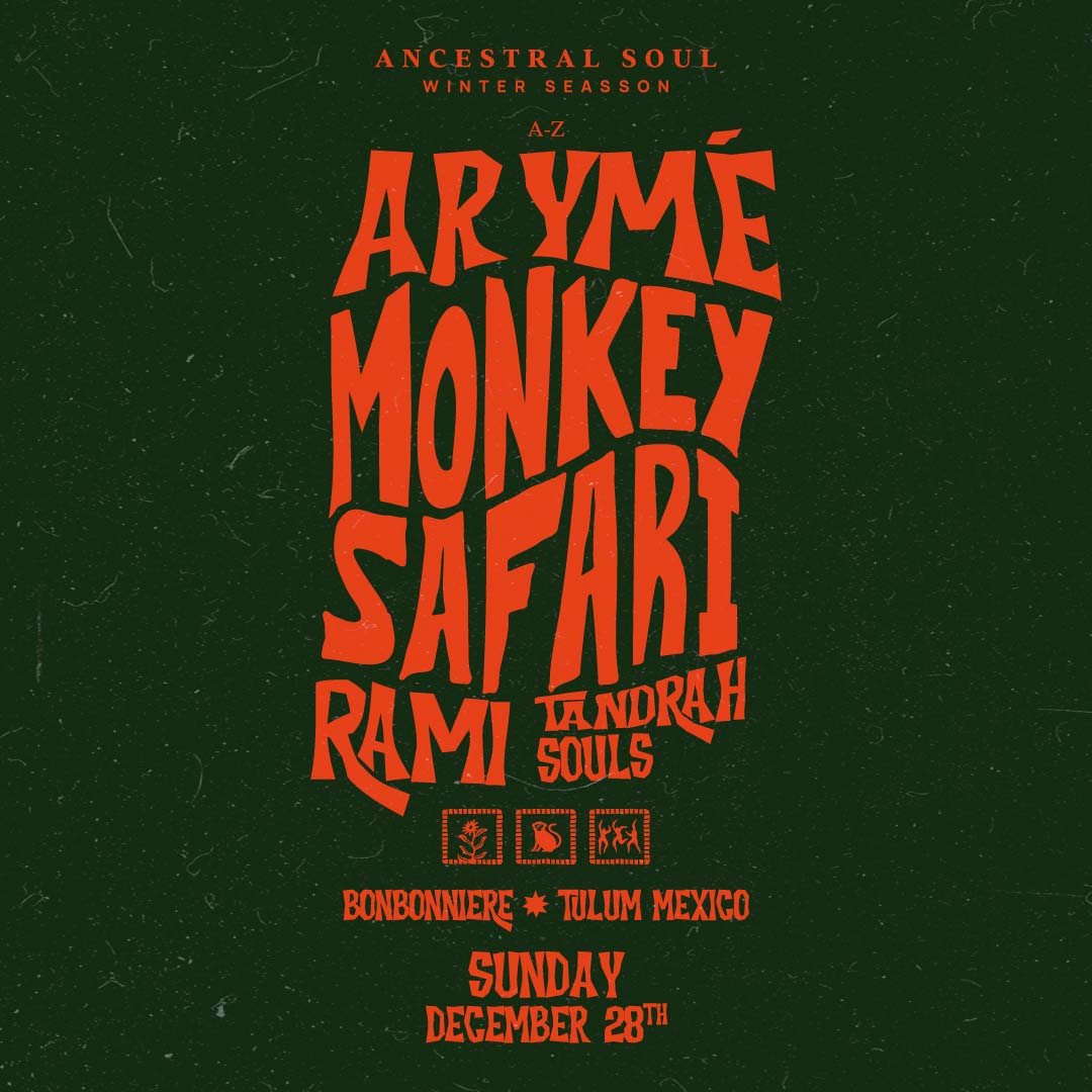 This Sunday, December 28th, Ancestral Soul returns to Bonbonniere Tulum for one of the most anticipated nights of the winter season. Headlining the ritual: Monkey Safari, alongside Arymé, Rami, Tandrah, and Souls.