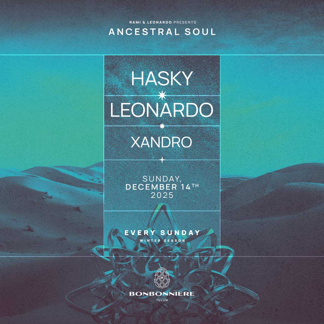 Neste domingo, 14 de dezembro, venha viver o próximo capítulo de Ancestral Soul, apresentado por Rami & Leonardo. Uma jornada sonora guiada por Hasky, Leonardo e Xandro, com batidas tribais e atmosfera espiritual em meio à selva de Bonbonniere Tulum.